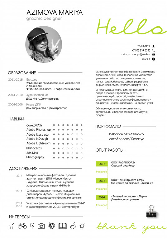 - Креативность, аккуратность, ответственность в работе. - Имею огромное желание расти профессионально и личностно. - Уверенный пользователь CorelDRAW и Photoshop, а так же Illustrator, InDesign ; MC Office, Lightroom, Photostory. - Базовые знания 3Ds Max и Rhinoceros 3D - Разработка логотипа, фирменного стиля, создание макетов полиграфической продукции, наружной рекламы; разработка макетов сайта и приложений. - Знания в области шрифта и типографики. - Навык обработки фотографий; создание фирменных упаковок. - Имею художественное образование (6лет). Пишу картины на заказ (преимущественно акрилом, смешанная техника). * Портфолио могу выслать по почте.